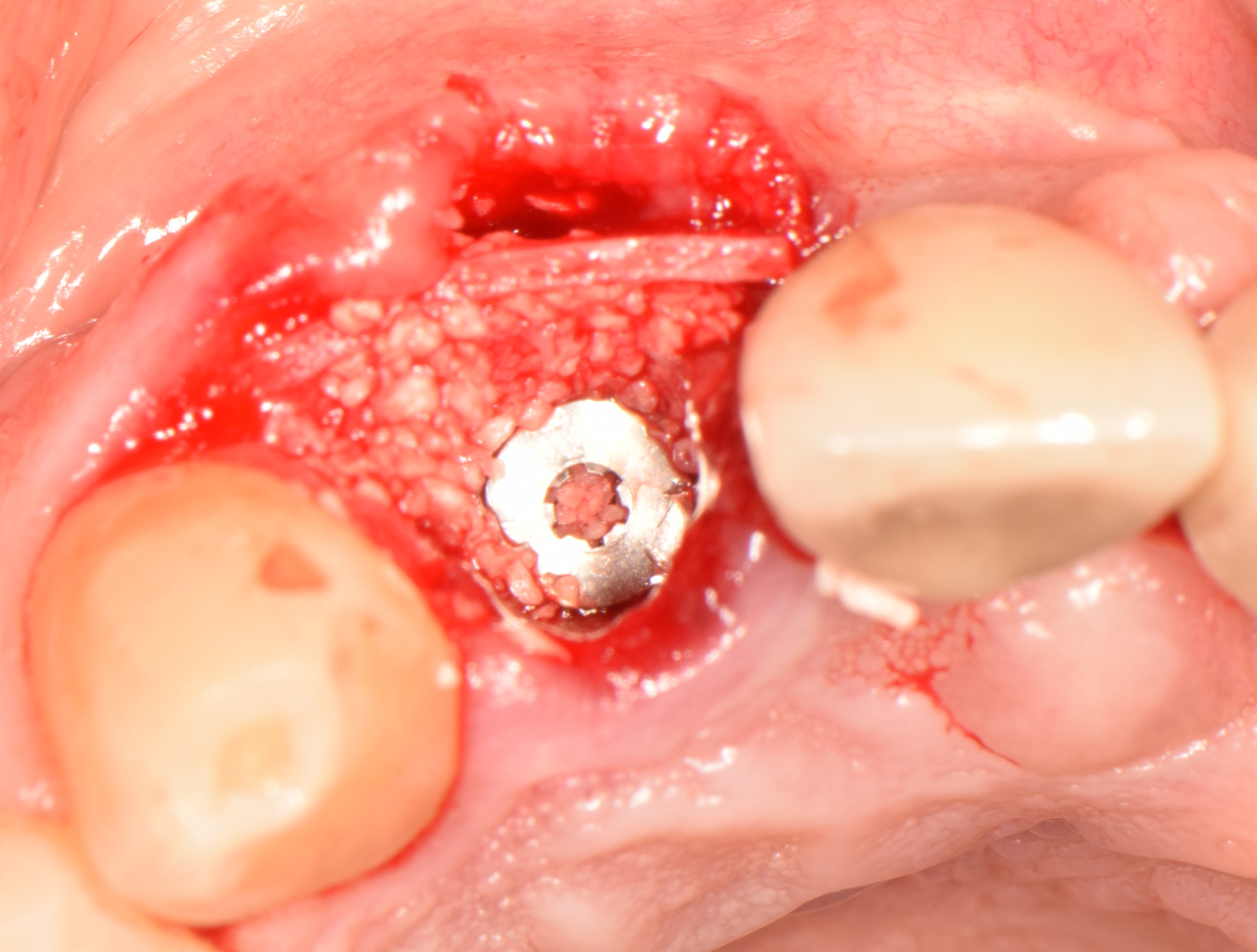 El caso clínico que nos ocupa se refiere a una paciente de 62 años que acudió al dentista por la descementación del elemento dental 12. El examen radiográfico mostró una fractura radicular que hacía irrecuperable el elemento. Se extrajo la raíz restante y se elevó un pequeño colgajo y se realizó una incisión fijada con pegamento de fibrina. La cavidad formada entre la lámina y el implante se rellenó con injerto óseo granular conservado con colágeno, estabilizado con pegamento de fibrina. La operación se completó suturando las papilas y aplicando un tornillo de cicatrización. A los 9 meses de la regeneración, se realizó una radiografía de control que mostró una excelente integración del injerto granular y el mantenimiento de los picos óseos mesial y distal.