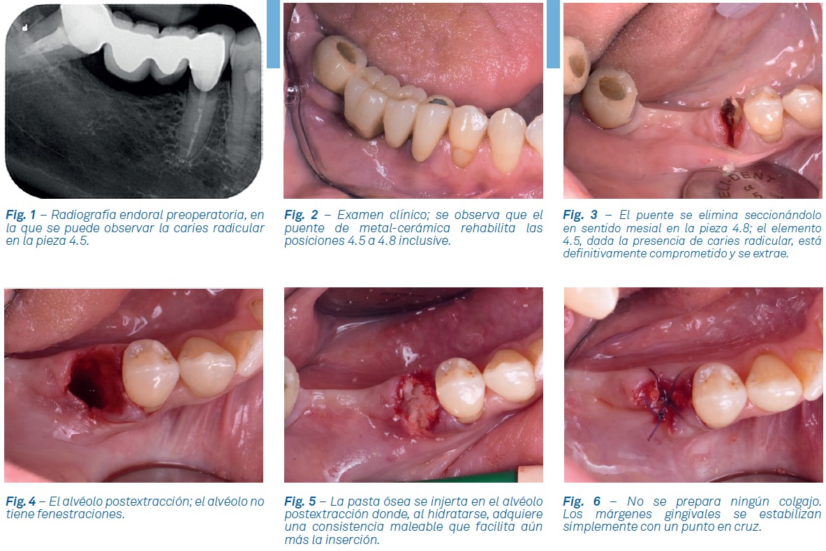 El paciente se presentó ante el cirujano con un puente en la arcada posterior derecha, para rehabilitar los elementos de 4.5 al 4.8 incluidos; la pieza 4.5 presentaba una caries radicular que hacía que ya no fuera apta para soportar el puente; por lo que se programó la extracción de la pieza 4.5 y la realización de una cirugía de ridge preservation (preservación de cresta) para realizar, en un futuro, una rehabilitación protésica sobre implantes. A continuación se extrajo la pieza 4.5 comprometida definitivamente y, sin realizar ningún colgajo, se injertó el alvéolo con pasta ósea liofilizada. La rehabilitación del paciente incluyó, al cabo de 6 meses, la inserción de dos implantes osteointegrados para sostener una prótesis sobre tres piezas.