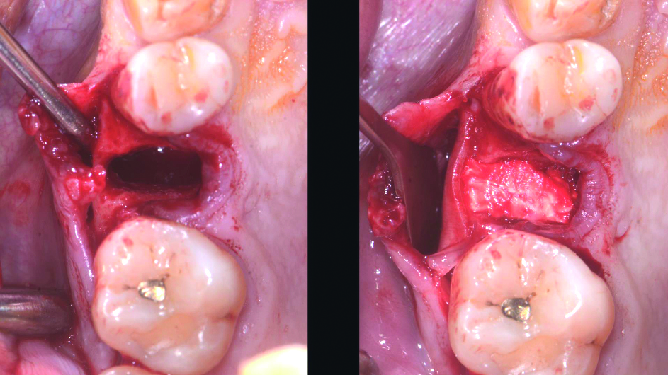 Il caso clinico riguarda un paziente con elemento dentale 14 fratturato, unitamente a fenestrazione vestibolare, estesa fino all’apice dell’elemento dentale, e riassorbimento palatale di 2 mm. L’intervento ha previsto l’incisione delle papille e lo scollamento a tutto spessore dei tessuti vestibolari estendendosi oltre la fenestrazione, con sollevamento del periostio, in modo da creare uno spazio per l’alloggiamento della lamina corticale. La lamina veniva opportunamente tagliata, per adattarla all’alloggiamento e veniva idratata con il sangue del paziente. La lamina veniva quindi incollata sul lato vestibolare, utilizzando gocce di colla di fibrina. A 4 mesi dall’intervento veniva effettuato l’esame CBCT, dal quale si evidenziava l’ottima rimineralizzazione dell’alveolo, con completo mantenimento del profilo corticale, chiusura completa della fenestrazione e assenza di riassorbimento osseo. Nel sito rigenerato veniva dunque posizionato un impianto 4 x 10 mm. Dopo ulteriori 3 mesi, l’impianto veniva protesizzato con pilastro Curvomax e una corona cementata in metallo ceramica. Il successivo controllo evidenziava una perfetta integrazione della protesi e un risultato estetico ottimale, con ripristino della fisiologica convessità vestibolare.