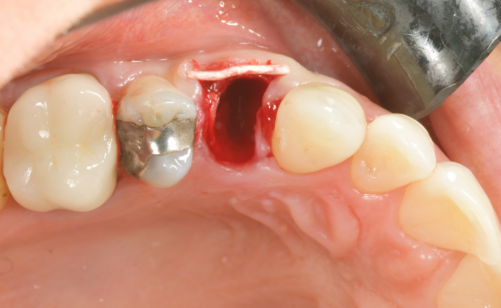 Il caso clinico riguarda una paziente con fistola vestibolare e dolore a carico dell’elemento dentale 14, di cui si notava una leggera mobilità. L’analisi tramite CBCT confermava il sospetto di frattura verticale dell’elemento in questione e rendeva evidente sia l’ampio difetto parodontale distale che la quantità esigua di osso alveolare. Dopo opportuna valutazione anamnestica, si decideva la rimozione dell’elemento dentale compromesso, con estrazione atraumatica delle radici; si decideva altresì per una preservazione alveolare da eseguirsi tramite inserimento di una lamina corticale flessibile, di spessore 0.5 mm. La CBCT a 4 mesi dall’intervento evidenziava un buon mantenimento dei volumi pre-estrattivi, con adeguata mineralizzazione dell’alveolo. Si è dunque potuto procedere con l’inserimento dell’impianto. A 10 mesi dalla rigenerazione ossea veniva consegnata la protesi definitiva. Si è potuto apprezzare un risultato estetico ottimale, con ripristino della fisiologica convessità vestibolare.